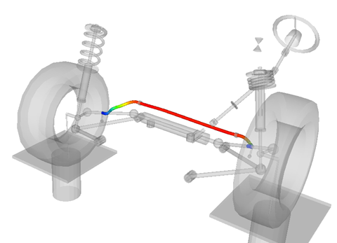 Figure 5. Result Contours for an NLFE Stabilizer Bar in a Front Suspension ModelYou may contour results of various types including displacements, rotation (CMS only), velocity (CMS only), acceleration (CMS only), strain, and stress. For strain and stress, you must request the corresponding modes to be computed during the component mode synthesis solution for a CMS flexible component; for an NLFE body, these are written to the H3D by default.