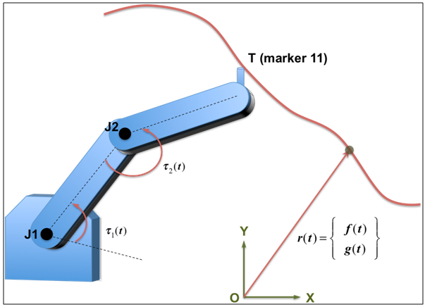 The third example demonstrates a simple 2D example where a constraint is applied at one point in the system but the reaction forces are desired at some other point. Figure 1 represents a 2D robot that is anchored to ground. The end-effector of the robot, T, is required to trace a path in 2D space as shown in the figure. F(t) and g(t) are specified through Spline/1 and Spline/2, respectively. The parameter t represents system simulation time. In the model, Reference_Marker 11 represents the tip of the end-effector.