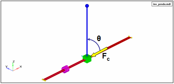 This example demonstrates the use of Reference_Variables to define Plant_Inputs for a control system defined in MATLAB. Consider the control problem of stabilizing an inverted pendulum mounted on a slider. The image below shows one such setup. The slider, the green block, is constrained to move along the global X-axis by a translational joint with ground, depicted as the red strip.