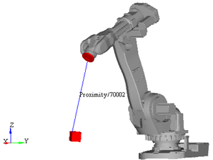 The image below demonstrates how the Sensor_Proximity element is used to track the minimum distance between a robot end-effector and a work piece.