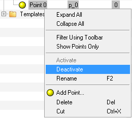 For example, a right click on a Point entity brings up a context menu that provides options to either: Deactivate, Rename, Add, Delete, or Cut the point entity along with options to filter entities.