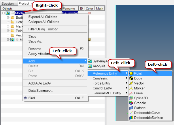Operation Action Left click on an entity like a Point, Graphic, etc. (while the Entity Selector and an entity icon is depressed in the toolbar). Selection (the selected entity is highlighted by a white boarder around it). Hold the left mouse button and move over the model (while the Entity Selector and an entity icon is depressed in the toolbar). Displays the entity name on the mouse tooltip and selects the entity upon releasing mouse button. Right-click on a model entity. Displays a context menu with various options: Select, Cut, and Delete against each entity name. Ctrl + Left mouse button Rotates the model (observe the mouse tooltip). Ctrl + Left click Picks the center of rotation. Ctrl + Right mouse button Translates/Pans the model. Ctrl + Middle mouse button Selects the window to fit. Ctrl + Middle click Fits the model to the window. The controls for the mouse can be found under :