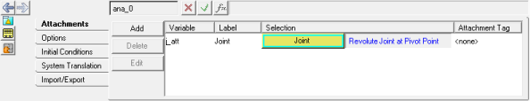 The varname of the attachment, declared in the *Attachment() statement (line 4) in the analysis definition file, appears as an argument in the *DefineAnalysis() statement (line 3). A motion is applied on this joint using the *Motion() statement (line 6). |