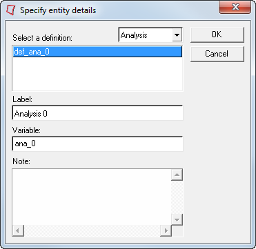 The varname of the analysis definition is specified in the *DefineAnalysis() statement (line 3). The analysis definition is used by ana1 in the *Analysis() statement (line 2). |