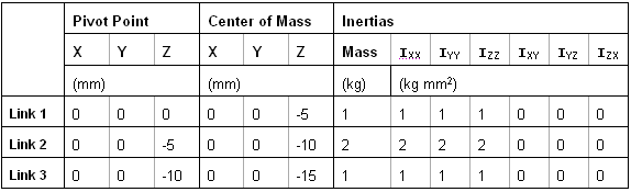 Figure 2. Properties table for the triple pendulum