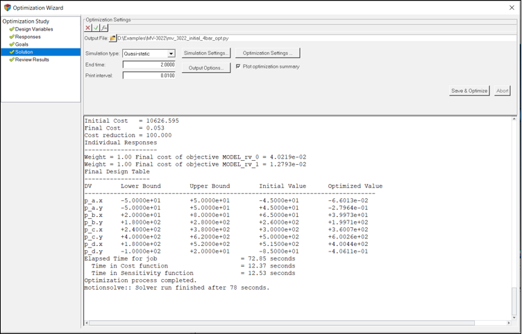 In this tutorial you will setup an optimization problem using MotionSolve's Optimization Wizard for a 4-bar model.