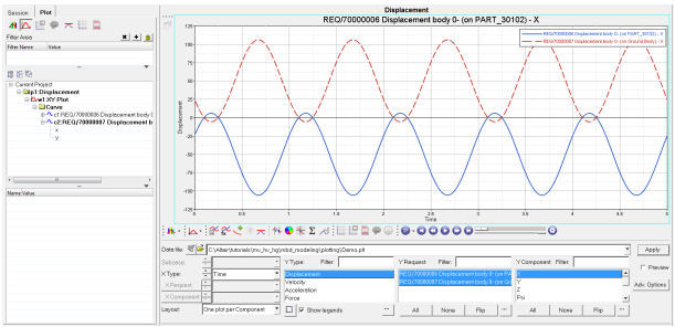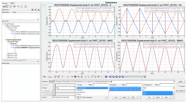 Learn to import MotionSolve results (plot) files for plotting curves, plot multiple curves in one window, plot multiple curves in different windows on one page, and save your work as a session file.
