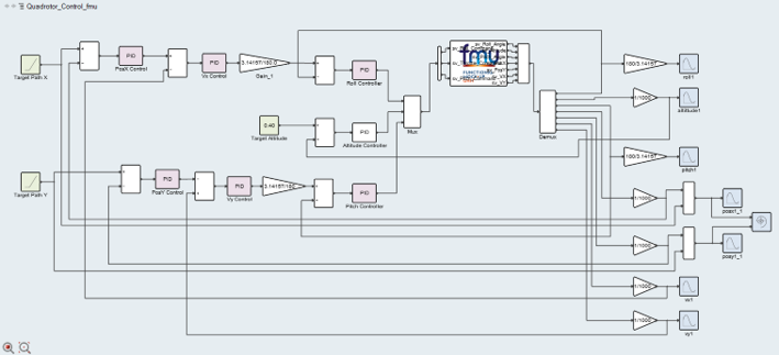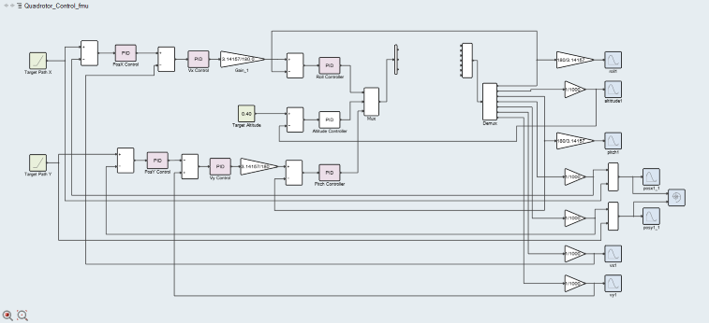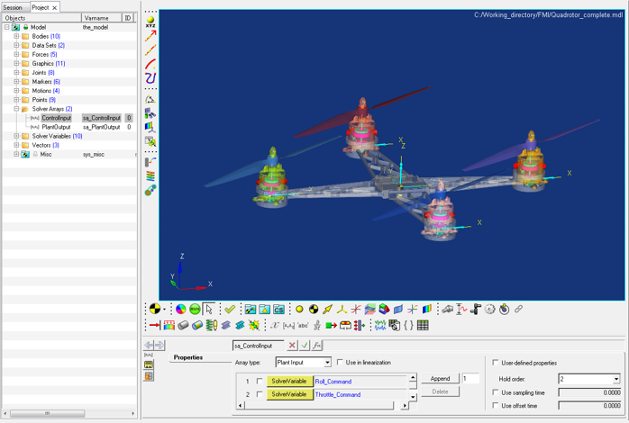 A model representing a quad-rotorcraft is used for this tutorial. The model structure, rotor blades etc. are modeled using MotionView/MotionSolve and Activate is used to control the spin rate of the rotors to control the thrust and lateral movement of the rotor. Roll forces are applied to the rotorcraft to mimic the effect of wind. The aim of the simulation is to control the thrust to make the rotor achieve a target height.
