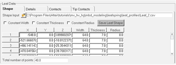 The Leaf Spring Builder is a utility designed to work with MotionView and the vehicle modeling libraries included with MotionView. Spring geometry, bushing rates and a number of other physical constants are required as input to the model. Reasonable defaults for data are included for many fields, which will make the model run. Accurate data should be substituted as it becomes available. The output of the utility is a beam and mass model of a leaf spring, in either a MotionView system definition file or a complete MotionView model.