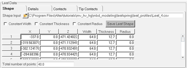The Leaf Spring Builder saves the data in an .lpf file. The file can be saved and loaded in the Leaf Spring Builder interface. The file is readable and is in TiemOrbit format. To make model changes, edit the spring data in the interface and build a new leaf spring system definition.