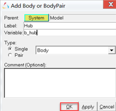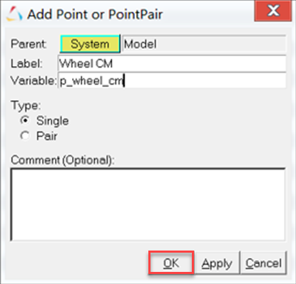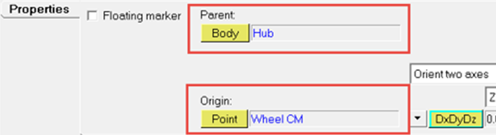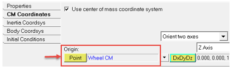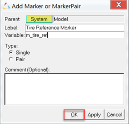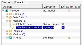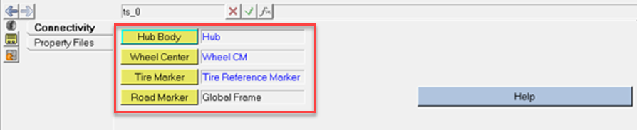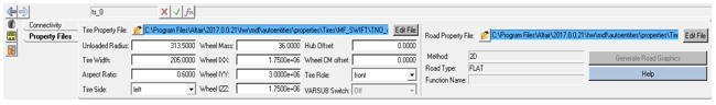 The tire models describe the interface between the wheel and the road. For this tire interface, the tire parameters and properties are set by a Tire Property File with the extension (.tir) while the road interface is described by a Road Property File with the extension (.rdf). One Body, one Point, and two Marker connections are needed to define the tire interface. In addition, physical properties of the tire must be specified such as: the unloaded radius, aspect ratio, width, mass, and moment of inertia's.