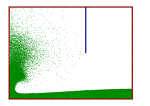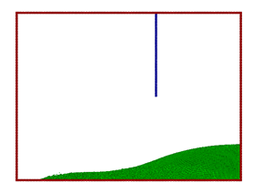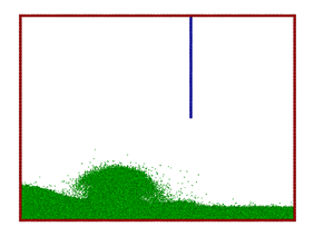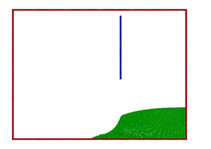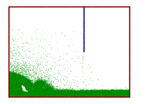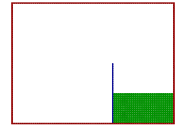 Initially, the particles are distributed on an equidistant Cartesian grid with dx = 5e-3 m. As the air is assumed to have only a very limited influence on the collapse of the water column it is neglected in the conducted simulation. To prevent the water particles from flying away, the geometry of the tank is mirrored to the upper half to close the geometry. From the beginning of the simulation on, the gate (blue) is removed with the approximate velocity in the experimental investigations of 3.46 m/s as stated by Lobovský et al. 1 The gate has to be chosen twice as thick as in the experiment as a representation by at least three particles is required for a wall boundary condition (see Adami et al. 2).