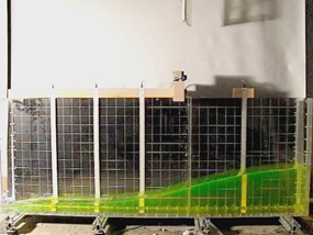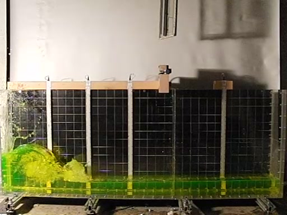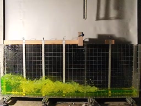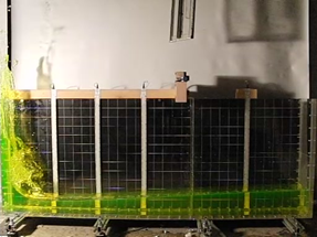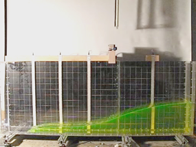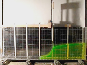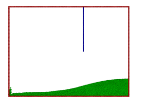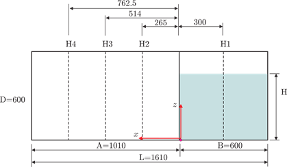 As shown above, the right part of the tank is filled with water (density: 997 kg/m3, kinematic viscosity: 8.9*10 -7 m2/s), with a height H of the water column. The experimental investigation comprise two different heights H = 300 mm and H = 600 mm, from which the former is simulated here. The setup is exposed to a gravity field with a constant acceleration of g = 9.81 m/s2 in negative z-direction. After the removal of the gate in positive z-direction, the water column collapses.