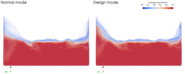 Figure 1. Time-Averaged Oil Distribution for 2-Gear FZG Case (No Gears Shown). DESIGN mode is enabled for the image on the right, and NORMAL (default) mode is enabled for the image on the left. Both simulations were single phase. Run time of the NORMAL mode is 4h 33min, while the DESIGN mode ran in 59min (4.5x speed up).