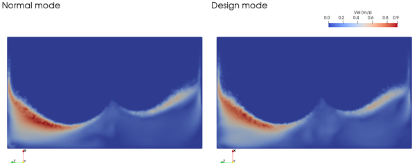 Figure 2. Time-Averaged Velocity Magnitude for 2-Gear FZG Case (No Gears Shown). DESIGN mode is enabled for the image on the right, and NORMAL (default) mode is enabled for the image on the left. Both simulations were single phase. Run time of the NORMAL mode is 4h 33min, while the DESIGN mode ran in 59min (4.5x speed up).