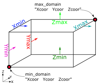Figure 1. . Sketch of the nanoFluidX Domain Boundaries. Each of the six bounding planes is marked in a separate color, with the colored arrow showing the surface normal of the boundary. The direction of these surface normals in the sketch has no influence on the code execution, they are provided to help visualize the domain. The two red dots at the opposite corners of the domain are minimum and maximum extent of the domain.