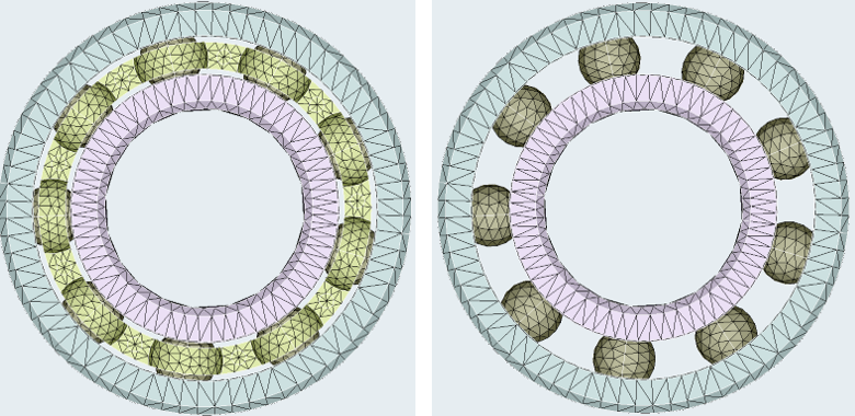 Figure 2. . Full bearing geometry, including the cage on the left. Simplified bearing geometry with removed cage on the right. With moderate resolution, typically several particles can pass between the rolling elements. - Many small rolling elements with or without the cage