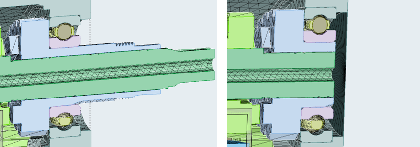 Figure 1. . Cross-section view of the shaft protruding outside of the gearbox housing (left) and the correctly shortened shaft with closed housing (right). The gap between the shaft and the housing will allow SimLab to recognize the volume without confusion. The gap between the wetted surface and the shaft is recommended to be on the order of the particle resolution.