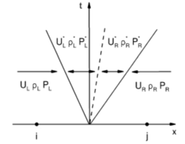 Riemann problem, such that the physical values of density (), velocity () and pressure () are expressed as:(1)
