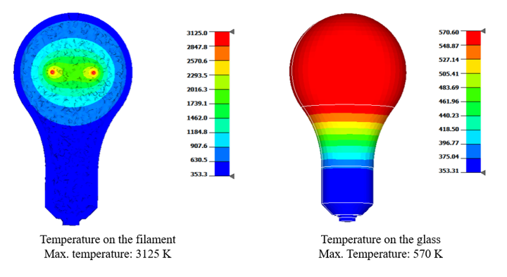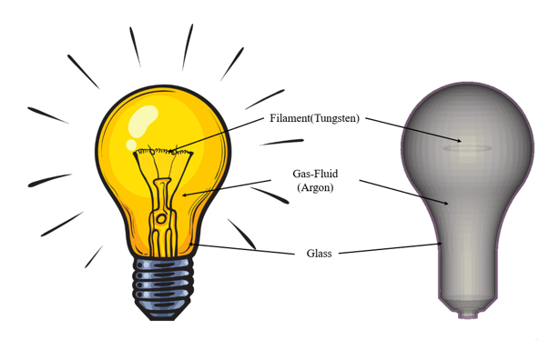 In this model, the air, which is fluid in this analysis, is meshed using SimLab and the filament gives heat generation, due to electricity of 1.2 W/mm3. The fluid mesh is an important step as it will transfer the heat from the filament to the glass. Appropriate material properties are given to the filament (tungsten), air-fluid (Argon gas), and glass. In this solution, CFD thermal flow is solved using AcuSolve and Structural Stress Analysis is solved using OptiStruct.