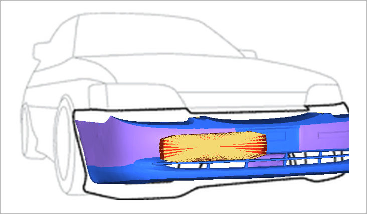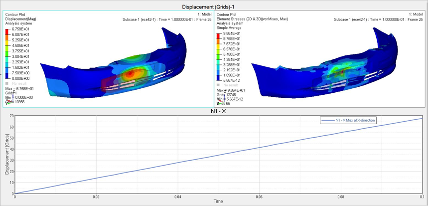 A car bumper, modeled using first order shell elements and which is constrained in all DOF’s at the mounting locations. The stopper/impactor is rigid body first order shell elements + RBE2 with added mass for the inertia effect, which is then constrained in all DOF’s except X-translation. Sliding Contact is defined between the surfaces of the bumper (area in contact with the stopper during impact) and for the stopper surface. The initial velocity (applied on the stopper) of -694.44mm/s is applied.