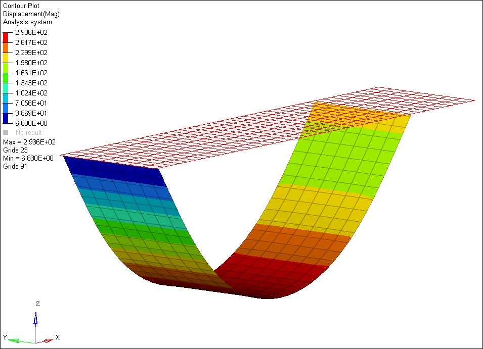 The maximum displacement of 293.5 is observed for the node 23 for the nonlinear large displacement subcase and a maximum displacement of 187.7 mm for the subsequent linear subcase.