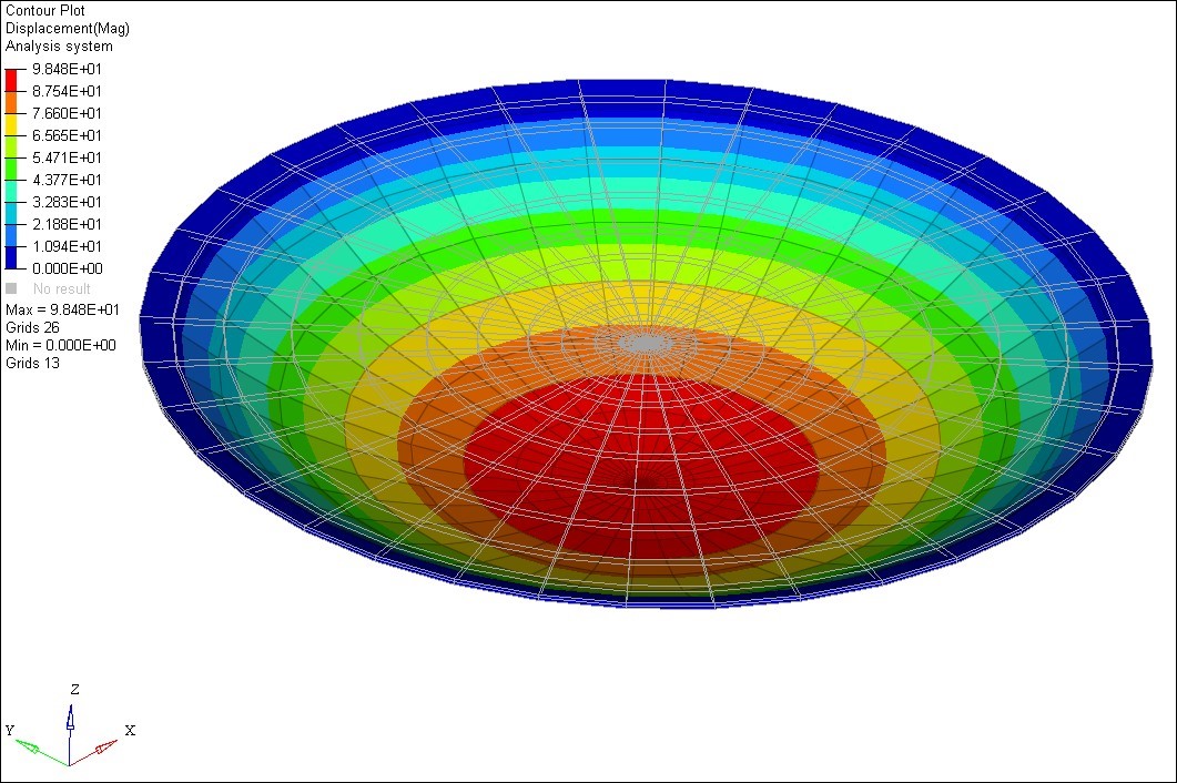 Model B is a circular plate of radius 300mm and 4mm thickness consisting of CHEXA elements. A pressure load of 1.0 MPa along negative Z-direction is considered for subcase 1 to perform nonlinear static analysis. The subcase 1 is considered as the preload in the subsequent modal frequency response analysis subcase.