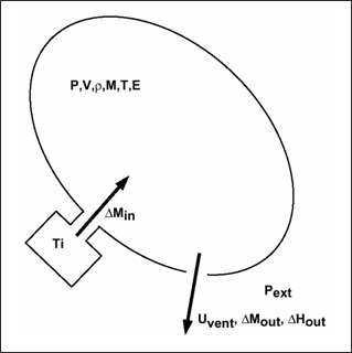 Uniform pressure is assumed inside the volume. Perfect gas law and adiabatic conditions are