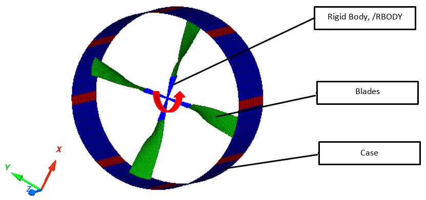 Figure 1.To keep the implicit solution in static equilibrium, a fully-constrained boundary condition (/BCS) is used on the main node of the rigid body that connects the base nodes of the blades. This fully-constrained boundary condition is removed in a second Engine file when rotation begins.