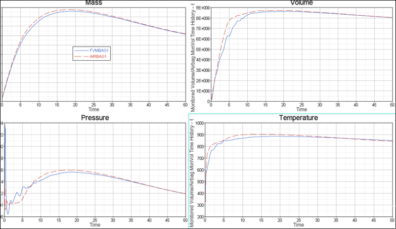 Figure 2. Comparison of Airbag Output for AIRBAG1 and FVMBAG1 Simulations