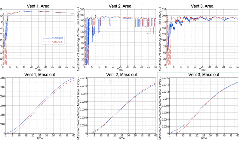 Figure 3. Comparison of Venting Parameters for AIRBAG1 and FVMBAG1 Simulations