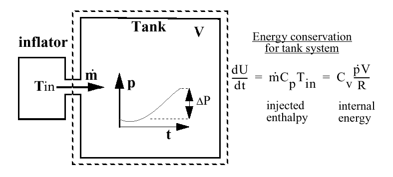 - Total injected mass, which can be derived from the mass of propellant in the pyrotechnic inflator and the chemical reaction; 40% is a typical value for the ratio of the produced mass of gas to the solid propellant mass.