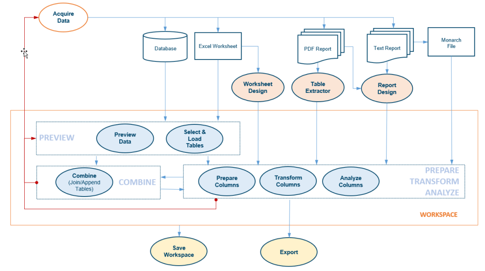 Tables from a variety of sources, such databases, the Data Source library, Excel worksheets, PDF/Text reports, and Monarch files, may be previewed before they are brought into Monarch Data Prep Studio. If the data source contains multiple tables, you may select which table(s) to open. Once in Monarch Data Prep Studio, your data can be prepared, combined, transformed, and analyzed. These operations are carried out in what is called a workspace. When ready, you can either save your data to the workspace or export them to a variety of formats.