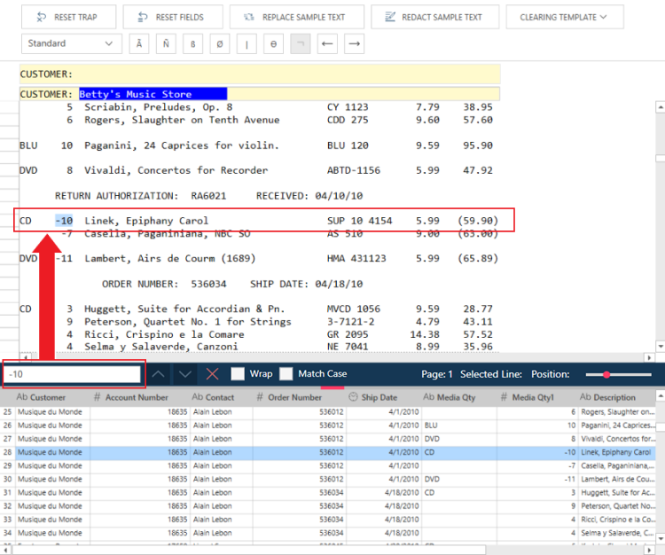 The data preview panel displays a sample of the details captured during a trapping operation. As you review the contents of this panel, you may wish to locate the record from which a row in the panel was obtained. Monarch Complete allows you to search for details in a report from the Report Design window without having to scroll through it.