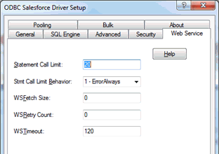 When setting up the Salesforce driver, the ODBC Salesforce Driver Setup dialog displays. After confirming a connection to the database you desire, select the Web Service tab of the setup dialog.