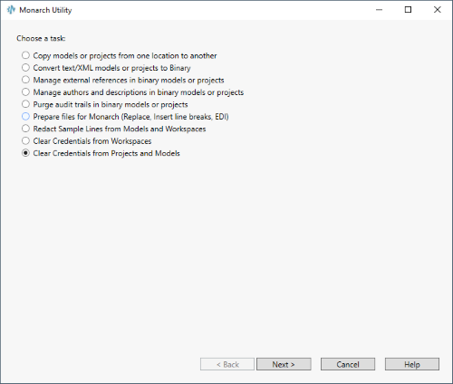 Launch the Monarch Utility wizard and ensure that the button for Clear Credentials from Projects and Models is selected. Click Next when you are finished.