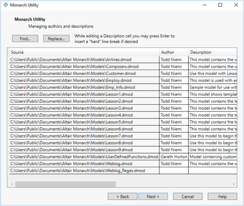 Launch the Monarch Utility wizard and ensure that the button for Manage authors and descriptions in binary models or projects is selected. Click Next when you are finished.