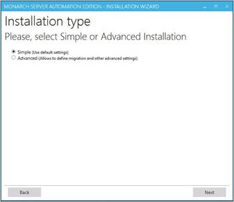 3. The Installation type dialog box appears. Choose between Simple installation and Advanced installation, and then click Next.