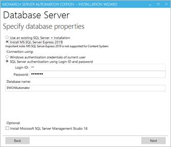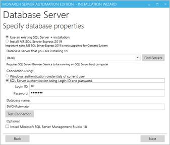 Install MS SQL Server Express 2019: Select this option to install SQL Server Express 2019 on the local machine. In this case, the name of the database server instance will be DWCHAutomator.