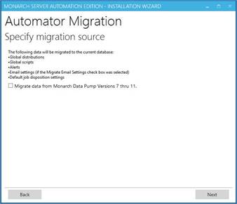 Select Migrate data from Monarch Data Pump Version 7 thru 11 and specify the following migration settings: