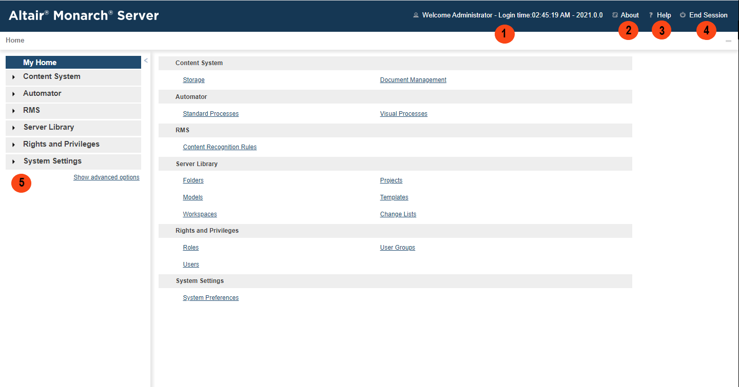 This panel serves as the navigation point for Monarch Server. Click Show advanced options to see all available sections in the system. |