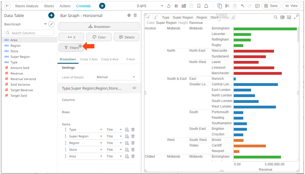 2. To add to the filter, drag text columns from the Data Table pane to the Filter drop area.