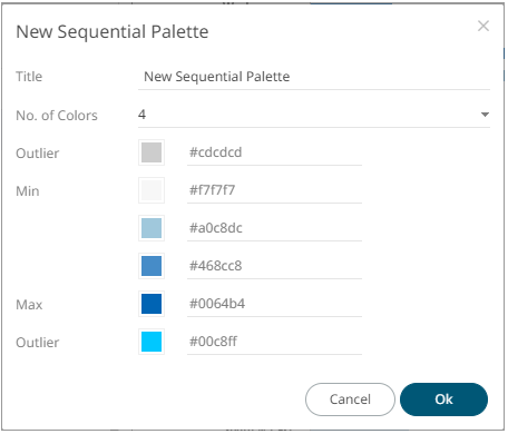 Sequential palettes use a two-color gradient between a minimum and a maximum value. Numeric column containing only positive values default to a Sequential Palette using the White-Blue color palette.