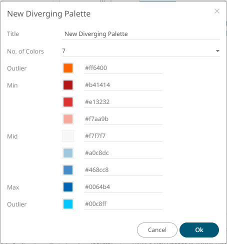 4. Set the Outliers, Min, Mid, and Max colors. Refer to step 4 of Creating a New Text Color Palette for more information.