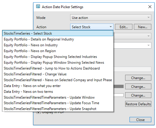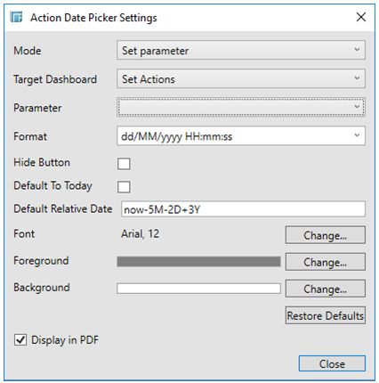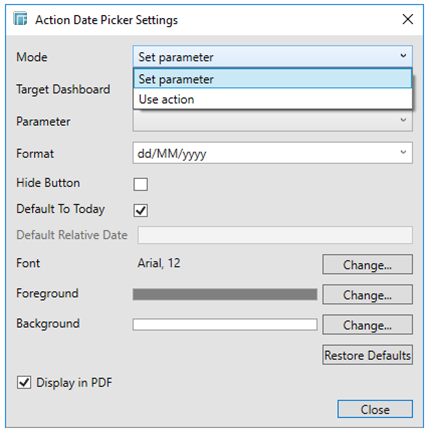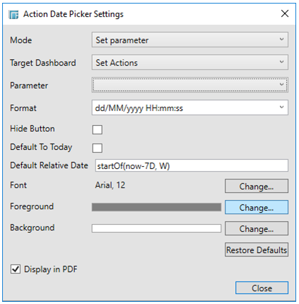 check the Default to Today box. This allows the Action Date Picker to check the current value of the dashboard parameter. If is set to null/empty, an action is executed to update the parameter and trigger the loading of the parameterized data with today’s date.