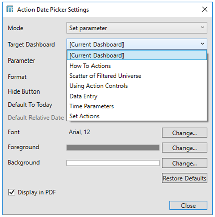 The default is Current Dashboard. When copying the action control to another dashboard or workbook, the target dashboard is automatically set to the new dashboard instead of where it was originally located.