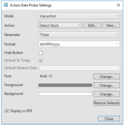 The Default to Today and Default Relative Date options are disabled in the Use Action mode.