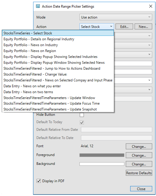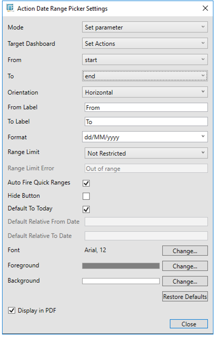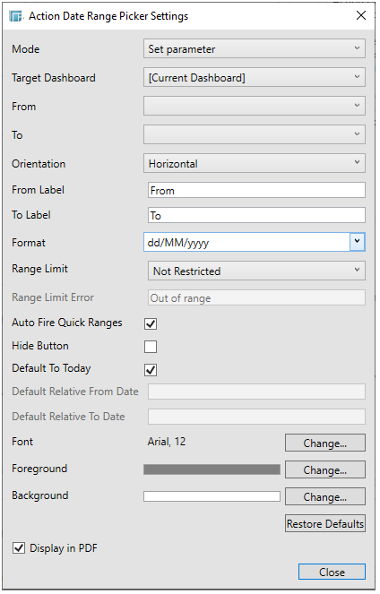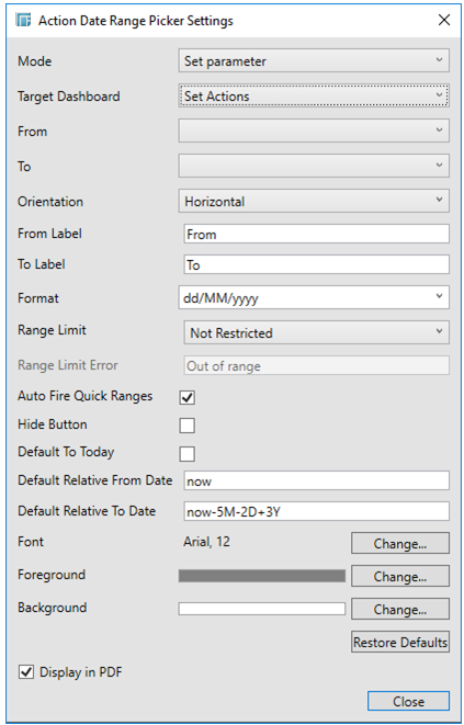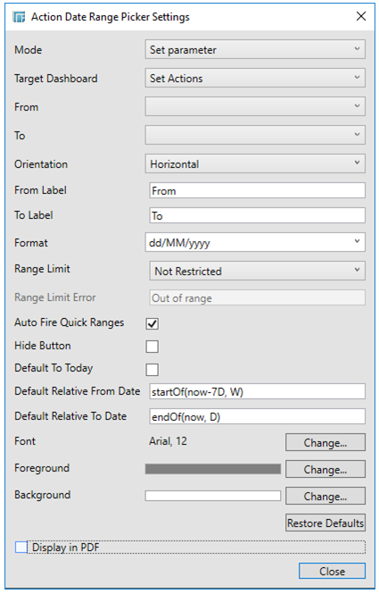 Check the Default to Today box. This allows the Action Date Picker to check the current value of the dashboard parameter. If is set to null/empty, an action is executed to update the parameter and trigger the loading of the parameterized data with today’s date.