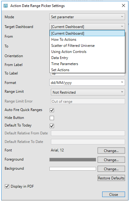 The default is Current Dashboard. When copying the action control to another dashboard or workbook, the target dashboard is automatically set to the new dashboard instead of where it was originally located.
