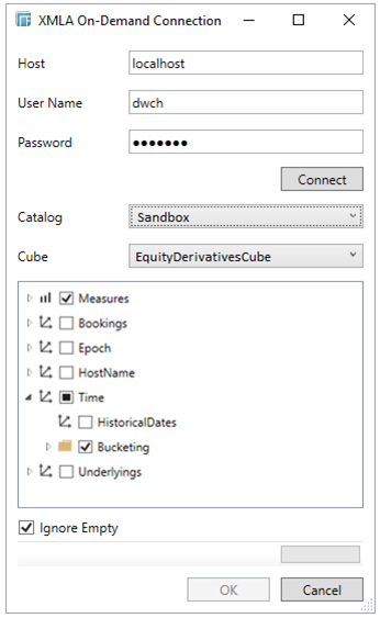 Click Connect to load the data from the database. This populates the Catalog and Cube drop-down lists.